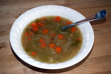 * Combine split peas, carrots, celery and 1 onion with broth.