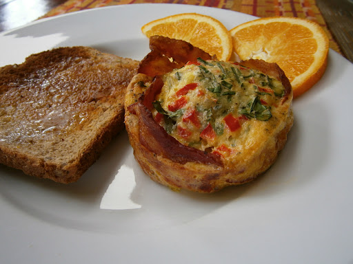 Wrap bacon around inside of ramekin, place leftover in bottom,or line Ramekin with Ham or Proscuitto.