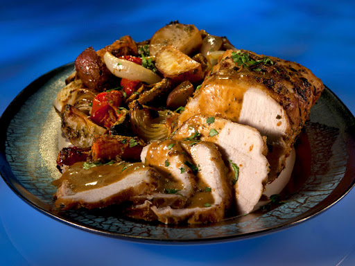 Slice the pork thinly on a slight bias and serve with the jus and vegetables.