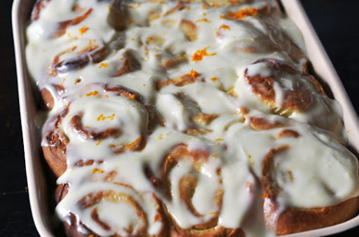 When the rolls are done, smear them with the cream cheese glaze, and sprinkle the final part (1/3) of the lemon zest over top to garnish. Let cool for at least 10 minutes before serving, but do serve while still warm.