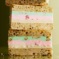 3) Let the ice cream soften in the refrigerator until spreadable. Remove 1 of the cake layers from the freezer and cover with an even layer of the softened vanilla ice cream, spreading all the way to the edges of the cake. Transfer to the freezer for 15 minutes. Repeat with the strawberry ice cream, then the pistachio ice cream. Top with the second cake layer and freeze until set, at least 1 hour.