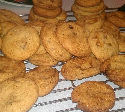 Yummy combination of Toffee bits and Snickerdoodles. You may be tempted to add extra toffee pieces but don't, more is NOT better in these cookies, you will have toffee melting all over the place if you use too much.