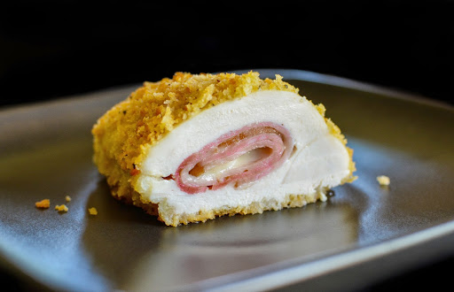 Using a sharp paring knife, carefully cut a horizontal slit into the side of the chicken breast, leaving a 1/2" border on the opposite end. Tuck the ham and cheese log inside and ensure that the chicken is properly encasing the filling. Transfer the chicken to the refrigerator for 20 minutes while you finish the remaining prep work.
