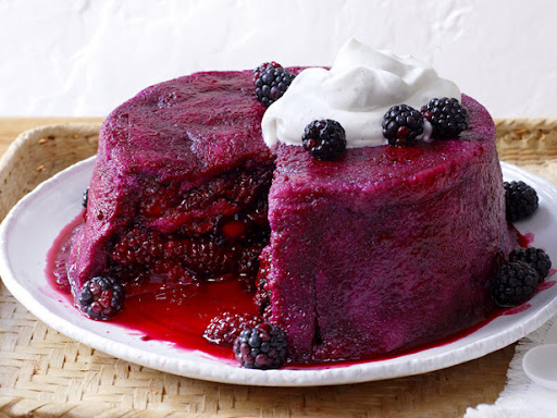 Remove the plate and plastic wrap and set the souffle dish in a sink filled with 1 inch of warm water to loosen the pudding. Place a serving plate on top, invert the pudding onto the plate and remove the plastic wrap. Serve with the whipped cream and more blackberries.