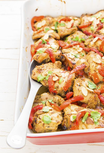Bake the chicken for 20 minutes, then remove the foil. Baste the chicken with the sauce, then add almond slices and cook for an additional 20-30 minutes uncovered, or until the chicken is cooked through. Garnish with parsley.