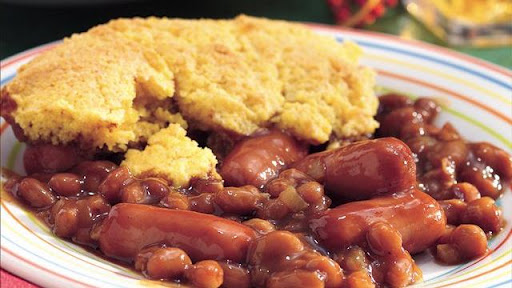 2) Prepare corn muffin mix as directed on package, using milk, margarine and egg. Spoon batter evenly around edges of hot bean mixture.