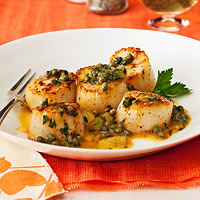 Season scallops. In a large skillet, melt 1 tbsp butter over medium-high. Add scallops; cook until golden, 3 minutes. Transfer to plate. Brown remaining butter. Add remaining ingredients; season. Spoon over scallops.