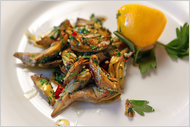 3. Add the red pepper, garlic and parsley. Stir well and let sizzle for a minute or so. Transfer the artichokes to a platter, sprinkle with coarse salt and serve with lemon wedges, or sprinkle sparingly with red wine vinegar. Eat hot, or at room temperature.