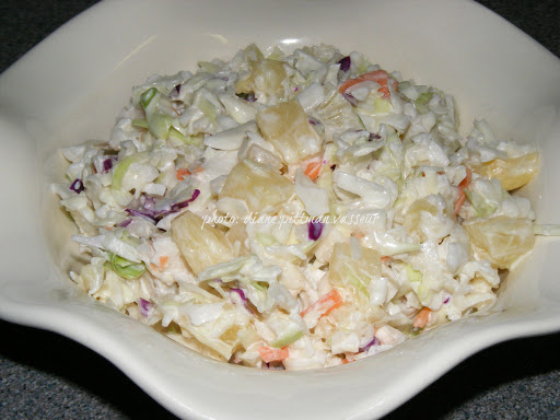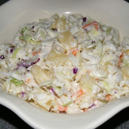 This uncommon combination of coleslaw mix and canned pineapple is tossed with a sweet and tangy homemade dressing. Don't be skeptical like I was at first, this was really good!