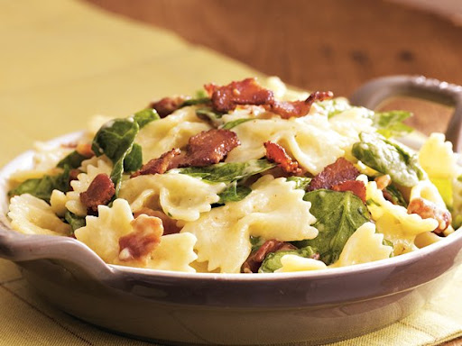 4) Pour cheese sauce over pasta; stir until coated. Stir in spinach. Reserve 1/4 cup of the bacon; stir remaining bacon into pasta mixture.
