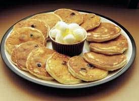 2. Beat Bisquick, sour cream, milk and eggs in large bowl with wire whisk or hand beater until smooth. Stir in blueberries. Pour a little less than 1/4 cup batter for each pancake into hot skillet.