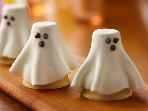 Lightly spray serving platter with cooking spray to prevent cupcakes from sticking to plate. Turn 1 cone upside down, and place 1 fondant circle over cone, draping fondant to form ghost body. Place 2 miniature chocolate chips on face for eyes and 1 for mouth; if necessary, moisten fondant with a little water so chips stick. Store covered.