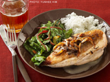 Heat a grill pan (we used a deep sauce pan, so not to lose the onions) over medium-high heat. Brush some of the flavored oil over the chicken; place skin-side down in the pan and grill until golden and crisp, about 3 minutes per side. Transfer to a platter. Toss the onion in the remaining flavored oil and grill until slightly crisp and charred, about 5 minutes. Spoon the grilled onion and sauce on top of the chicken.