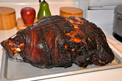 Heat oven to 250. Chop sage, thyme, rosemary and garlic together. Place in a bowl; add fennel, salt and pepper. Stir. Score pork skin in a cross-hatch pattern, making 1/2-1/4 inch deep cuts about an inch apart. Make 10 1/2-inch deep incisions and stuff them with half of herb mixture. Tie pork tightly with twine, brush olive oil over skin and rub with remaining herbs. Set skin side up and roast for two hours. Pour wine over pork and baste with juices. Continue roasting, basting every half hour until skin is well-browned, 2-1/2-3 hours more. Let rest for 15 minutes. For crispy skin, slice off cap of skin and fat. Broil, skin side up, three to six minutes. Slice roast and skin and serve together on a platter or crusty roll.