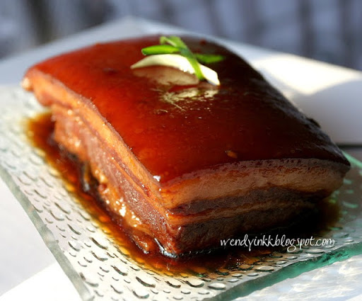 6. Remove pork belly (no gravy) from pot and put into a steaming dish, skin side up.