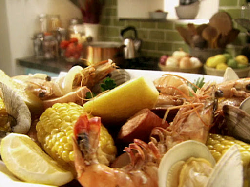 Add the potatoes to the pot to give them a head start; simmer for 20 minutes. Now add the corn and sausage; cook another 5 minutes, making sure everything stays covered with the liquid. Add the clams and boil for 8 to 10 minutes until they open. Then toss in the shrimp and shut off the heat. Cover the pot and let the shrimp steep in the flavor for 15 minutes. Drain and spread the shrimp, sausage, clams, corn, potatoes, and onions out on a newspaper-covered table. Serve with lemons and plenty of napkins.