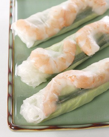 Place 2 shrimp halves, cut sides down, over the crease. Top with 3 chives so that about 4 inches of the chives stick out at one end. Continue rolling rice paper away from you to form a cylinder. Seal edges with a little water. Repeat entire process with remaining rice papers and filling.