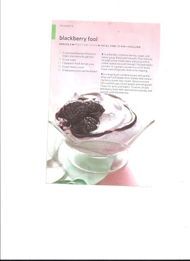 2.In a large bowl, combine cream and vanilla;whip until stiff peaks form. gently fold in reamining berry puree into cream. Spoon mixture into custard cups. Cover loosely and refrigerate 1 hour or up to overnight. To serve, drizzle blackberry fools with reserved berry puree and granish with Blackberries