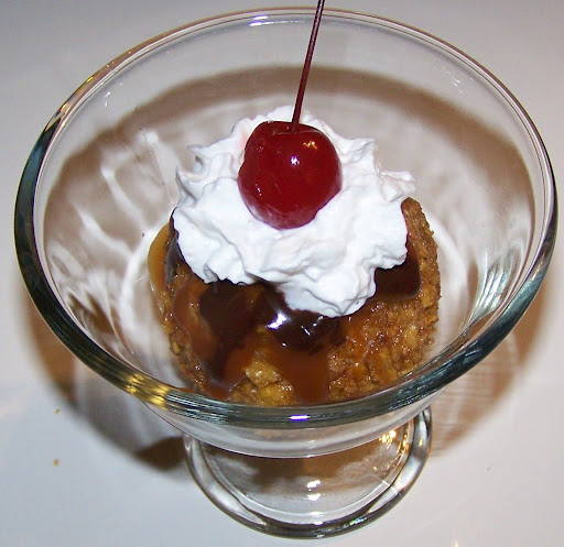 To serve: place a fried ice cream ball in a serving bowl, drizzle with 1 tablespoon of caramel topping, then chocolate topping.