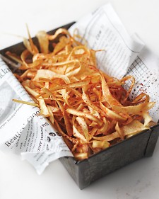 Heat 3 inches oil in a heavy medium-size pot until it registers 365 degrees on a deep-fry thermometer. Add parsnip strips to the oil in small handfuls (do not crowd), turning gently with a wire skimmer, until pale gold and crisp, about 45 seconds. Transfer chips to paper towels to drain, and sprinkle with salt. (Return oil to 365 degrees between batches.) Before serving, sprinkle with smoked paprika.