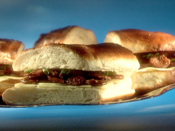 Spoon some of the pork mixture on the bread bottoms, top each with slices of cheese, the reserved bacon and the remaining green onions and finish with the bread tops. Serve immediately.