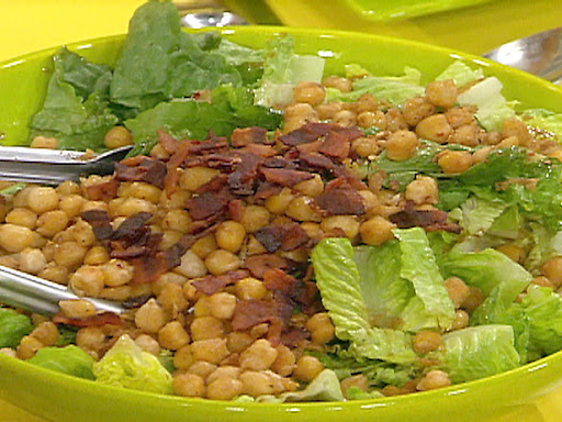 Place greens in a salad bowl. Whisk together the mustard, vinegar and about 1/3 cup extra-virgin olive oil. Add bacon and chickpeas to the salad and toss to coat evenly.