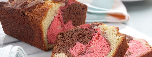 5. Spoon alternating colours into prepared pan. Draw a skewer or toothpick through the batter to swirl the colours.