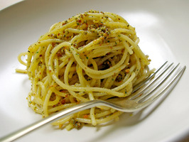 Cook the spaghetti in boiling, salted water until al dente. Drain. Toss in a bowl with the nuts (reserving some for garnish), olive oil, cheese, and orange zest, to taste, if using. Serve immediately.