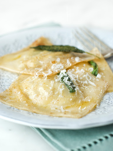 Boil ravioli in small batches until tender, about 3 minutes. Using a slotted spoon, transfer ravioli to the pan with the brown butter sauce and toss on medium heat to combine. Serve immediately with freshly grated Parmigiano.