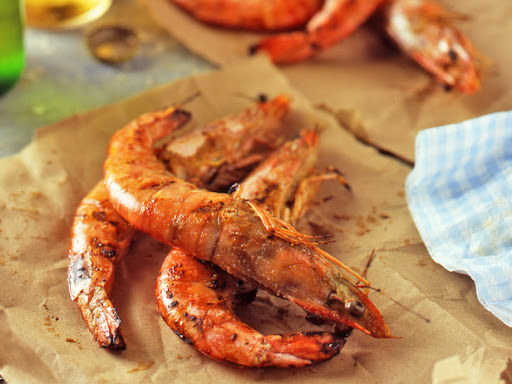 Preheat a grill to high. Remove shrimp from the marinade and grill for 1 1/2 to 2 minutes per side. Serve on brown paper bags, if desired.