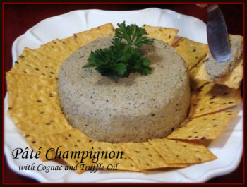 In a skillet over medium heat, melt the butter or margarine. Add the shallots/onions and mushrooms and sauté until the vegetables are nicely browned. Add the cognac, parsley, garlic, thyme and optional mushroom powder and sauté until the liquid has completely evaporated. Transfer the contents of the skillet to the food processor.
