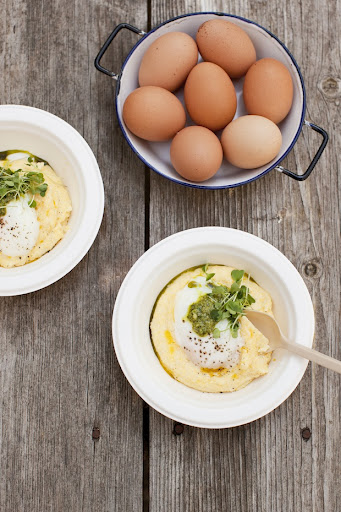 put polenta cake on plate use your thumb to make a small divet in the top of the cake for the egg to rest. put poached egg on top and sprinkle with a little salt, then add a spoon full of pesto.