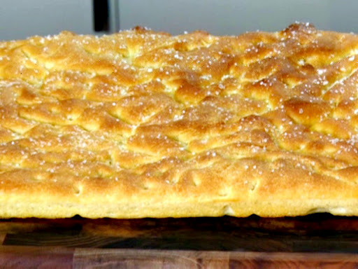 Liberally sprinkle the top of the focaccia with some coarse sea salt and lightly drizzle a little oil on top. Bake the dough until the top of the loaf is golden brown, about 25 to 30 minutes. Remove the focaccia from the oven and let it cool before cutting and serving.