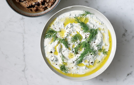 Blend feta and a splash of water in a food processor. Transfer to a medium bowl and mix in parsley, mint, and chopped dill; season with salt and pepper. Drizzle with oil and top with dill sprigs.