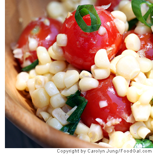 Foodgal has been making this amazing corn salad since it was first published in Gourmet magazine in 2000. That’s eleven years of corn, tomato, and scallion enjoyment! How’s that for a ringing endorsement. Easy and quick, you can serve it warm, at room temperature, or cold. It’s also great incorporated into a pasta salad or topped with grilled shrimp.