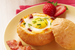 CRUMBLE 6 bacon slices; sprinkle into bread bowls. Top with VELVEETA. Crack egg over VELVEETA in each bowl; place on baking sheet.
