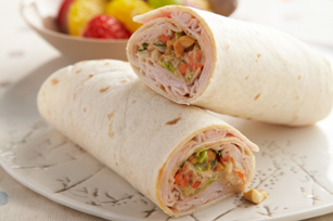 TOP tortillas with turkey, coleslaw mixture, nuts and cilantro; roll up.