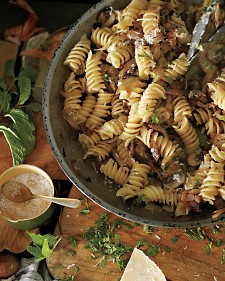Slicing, rather thatn chopping the onion creates the best shape for tossing with pasta. Browning the mushrooms unlocks their savory flavor; rther thatn pulling out another pan, move the cooked meat and onion to the side so the mushrooms havew as much conact as possile with the hot surface of the skillet.