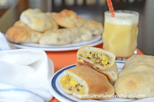 Makes 8-10 (depending on how big you cut the squares and how thin you roll the dough) These are great, not only for a brunch crowd, but also as a hearty, easy option before school. You can also make other kinds of hot pockets for dinner or lunch with any sort of filling: pizza, broccoli, BBQ beef, cooked chicken, deli meat and so on. Got this recipe from oneshetwoshe.com.