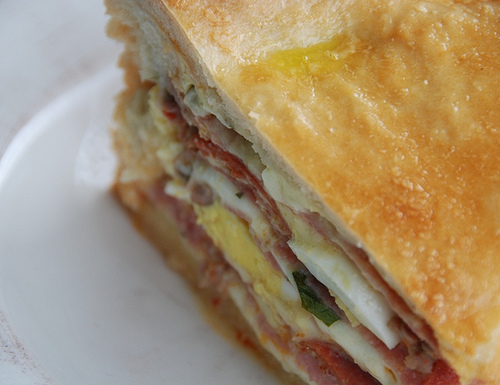 Fill the inside of the dough with alternating layers of sliced meats, cheeses, and sliced hard-boiled eggs. After 5-6 layers, pour half of the egg mixture over the filling allowing it to seep down. Continue layering the meats and cheeses, then pour the remainder of the the egg mixture evenly over the top. You should have enough for 10-12 layers.