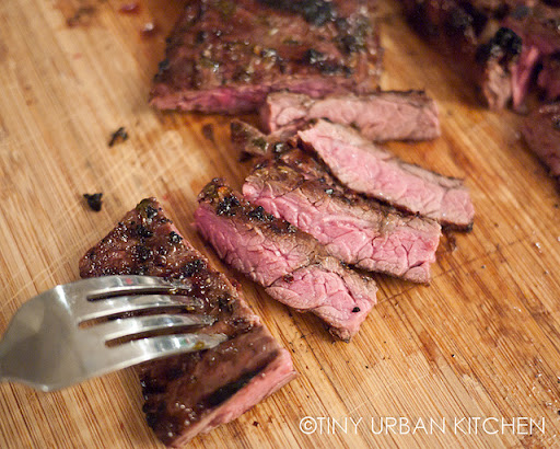 Remove the steak from the marinade, pat dry, and grill at high heat for about 2-3 minutes on each side. Let the steak rest for about 10 minutes. Slice against the grain and serve!