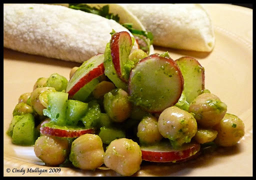 This recipe is from the Cooking Light 2009 Annual Recipes cookbook. We’ve been trying to eat healthier, get a little more exercise in, and my husband has been working on controlling his blood sugar levels. Chickpeas (garbanzo beans) are very good for you. So, this salad is not only tasty – it’s good for you too.