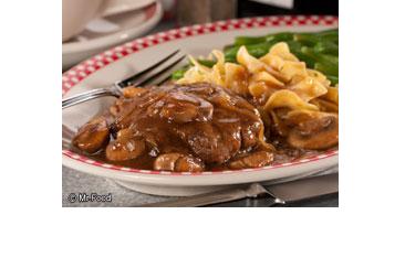 Over medium-high heat, cook mushrooms and sliced onion in drippings 5 minutes, or until tender, stirring constantly. Add broth and Worcestershire sauce to skillet. Return patties to skillet; bring to a boil. Cover, reduce heat, and simmer 15 minutes. Remove patties from skillet with a slotted spoon; place on a platter and keep warm.
