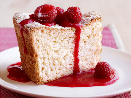Sprinkle one-quarter of the flour mixture over the egg mixture and gently fold with a rubber spatula. Fold in the remaining flour mixture in 3 additions. Transfer the batter to an ungreased 10-inch tube pan. Bake until the cake feels springy and a toothpick inserted into the center comes out clean, 40 to 50 minutes. Invert the pan onto a funnel or the neck of a bottle and cool completely. Loosen the edges with a small knife, tap the sides of the pan against the counter and unmold.