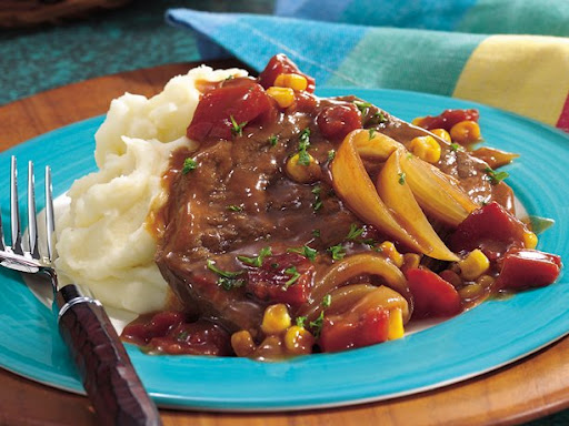 1 Heat oven to 325°F. In ungreased 13x9-inch (3-quart) glass baking dish, combine tomatoes, gravy and barbecue sauce; blend well. Add corn and onion; mix well. Place beef pieces in mixture; spoon mixture over beef. Cover with foil.