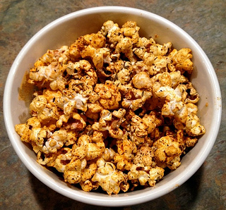 Drizzle the extra virgin olive oil over the popcorn about 1 tablespoon at a time and then toss after each application to ensure an even coating of the spices and olive oil. Finally, sprinkle the thyme leaves onto the popcorn and toss once more.
