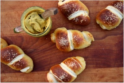 Place baking racks in the center and upper third of the oven. Preheat oven to 425° F. Line two baking sheets with parchment paper, and lightly brush the paper with oil. (Don't skip the oiling - it’s important to brush the paper or the pretzels will stick!)
