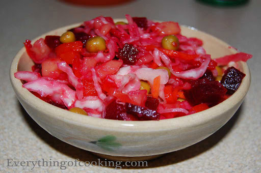 Veggie salad consists of boiled vegetables, peas and sour cabbage. In Russia we call it “vinegret”.