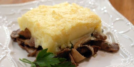 1. Steam the potatoes in a covered saucepan with about an inch-2.5-cm water in the bottom, until very tender. Mash with the butter and milk until very smooth, adding more milk if needed. Season with salt and pepper. Stir through the diced cheese. Distribute evenly over the mushroom mixture, and smooth with the back of the spoon (if you want to be very retro-housewife, make patterns with the tines of a fork or make waves with a spoon.) Sprinkle over the Parmesan.