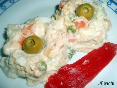 - Adorna la ensaladilla con las aceitunas y los pimientos morrones...pepinillos, espárragos o lo que desees, y directa a la nevera